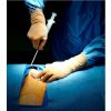 Waterproof jumpsuit-type body protection suit with hood, sewn seams, with safety tape that seals all seams, with front zipper closure, flap over the zipper for added protection, elastic at the wrists, hood and ankle for better fit and protection.